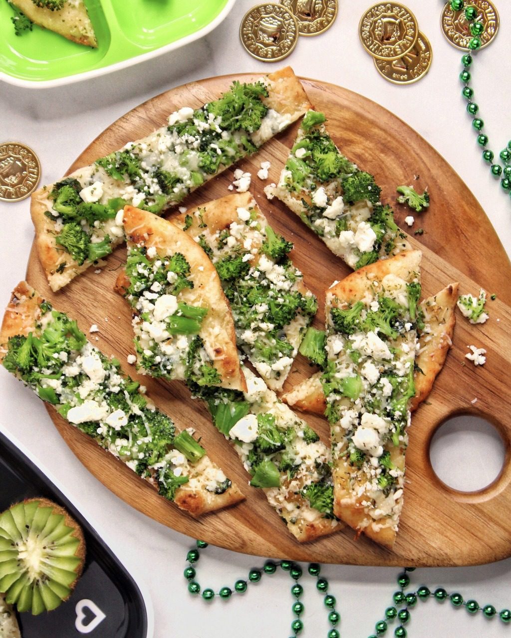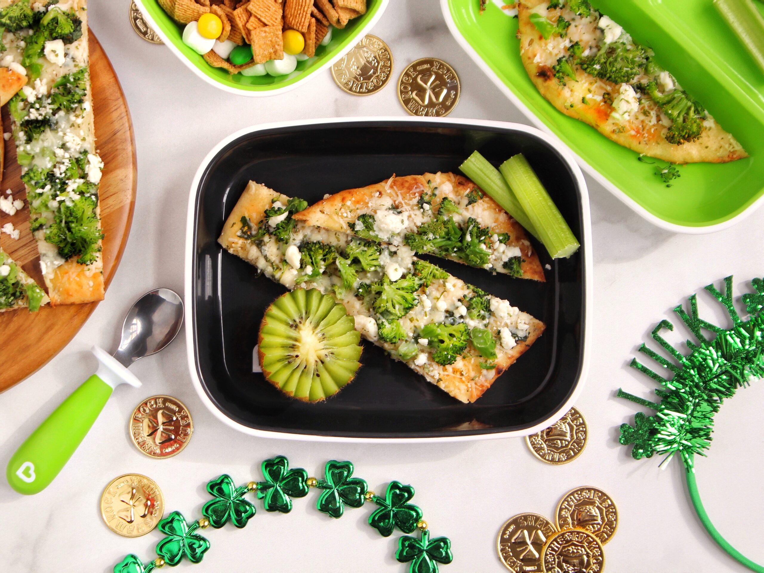 Do you celebrate all of the little holidays with your little one(s)? @lunchesandlittles here, and while we aren’t Irish, that doesn’t stop us from enjoying a little extra fun for St. Patrick’s Day! Our kiddos love these little holidays- even if we just do simple things like pack lunch boxes full of green foods, set out a handmade leprechaun trap, or just all sit down to enjoy a fun and festive dinner spread, like the one we are sharing here today, featuring our Three-Cheese Broccoli Pizza.