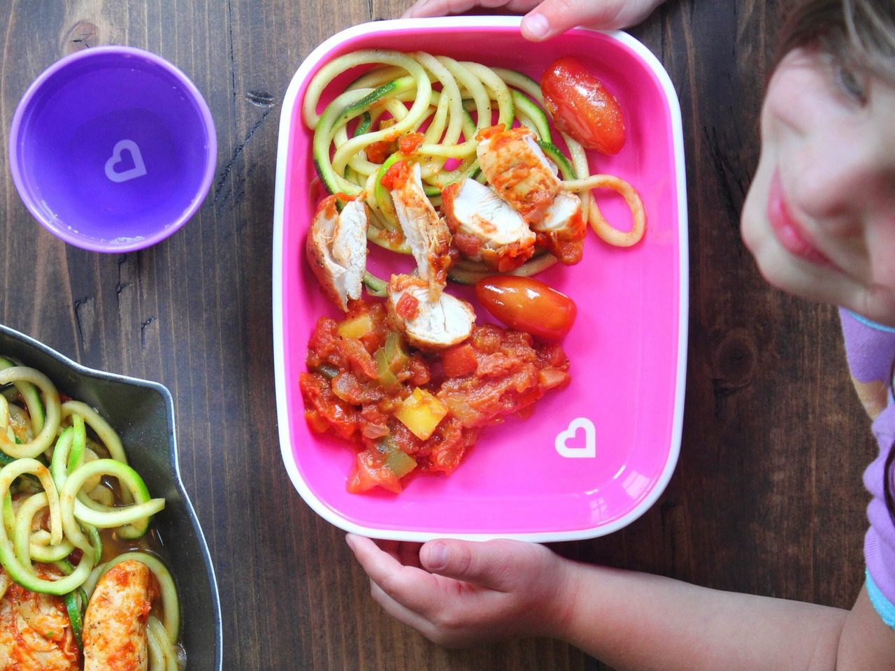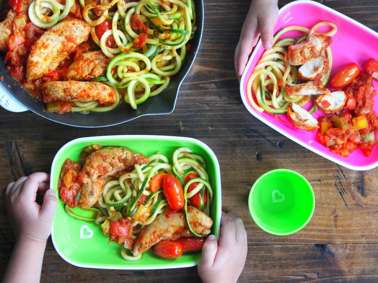 If you follow me over on my feed, @lunchesandlittles, you have probably heard me say a thing or two about colorful food. I am a firm believer that we all eat with our eyes first, and so creating dishes in my home that are colorful, fun and healthy are really important to me. This One Pan Chicken Cacciatore w/ Spiralized Zoodles is very colorful and the spiralized zucchini makes it extra appealing, doesn’t it? If you do not own a spiralizer, you can of course still make this dish using zucchini slices instead; I just have a love for all things spiralized (and totally recommend spiralizing some vegetables yourself! Our kids will eat several different things spiralized, that they would not otherwise eat).